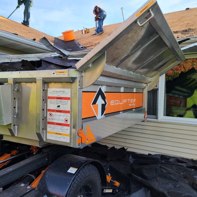 We strive to leave a jobsite as clean, if not cleaner- than when we left. The best way to maintain this objective with a roofing project, is to utilize our Equipter! The Equipter is a self driving, lift able trailer capable of reaching up and over landscaping to catch and haul roofing debris. Not many roofing companies go this far to ensure our customers properties stay clean.
